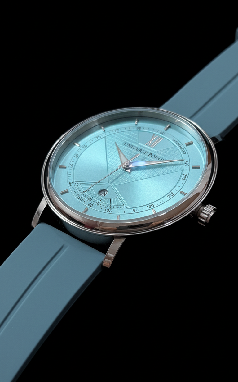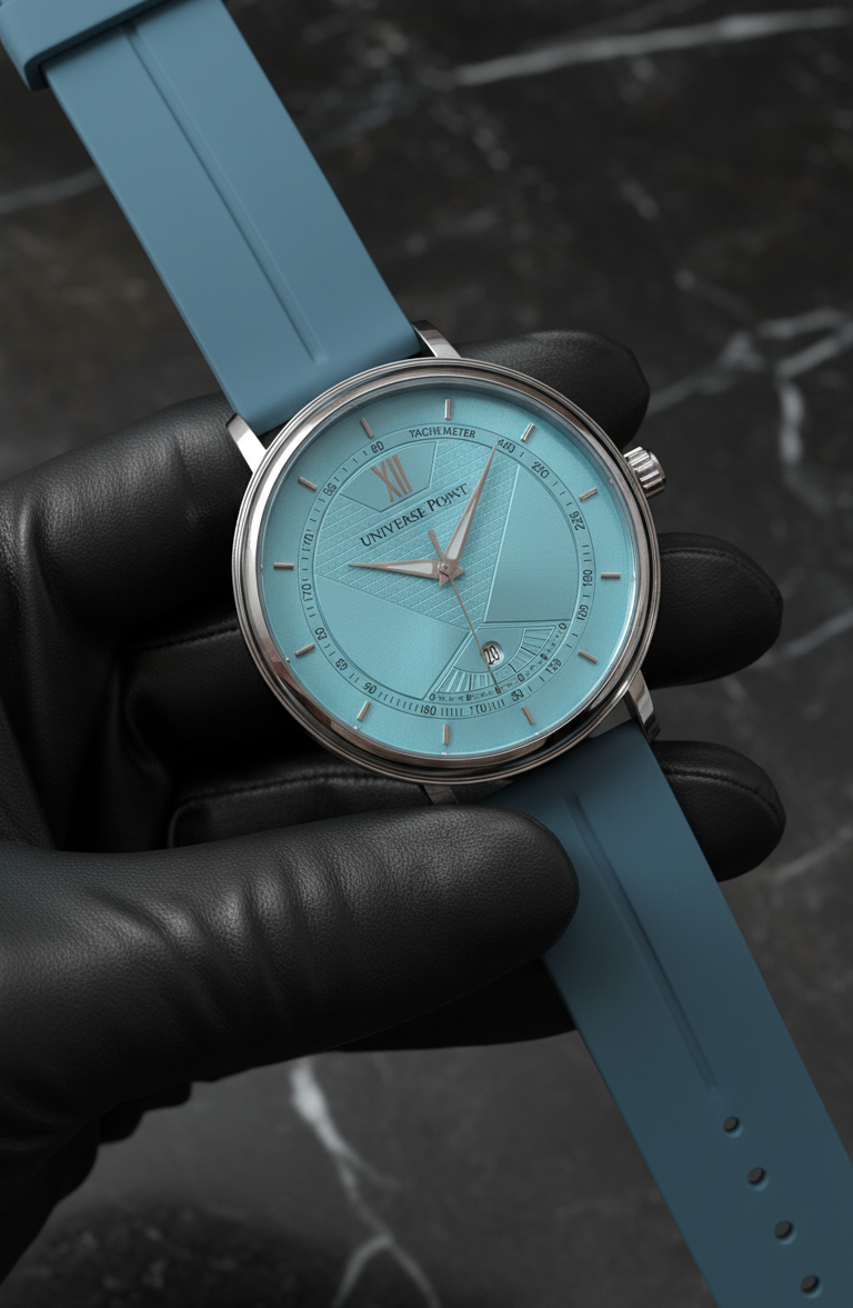 The centerpiece is the striking aqua-toned dial, which features a mesmerizing, geometric pattern reminiscent of an architectural blueprint. Every line, shape, and Roman numeral is meticulously crafted to create a visual statement that is both artistic and functional.