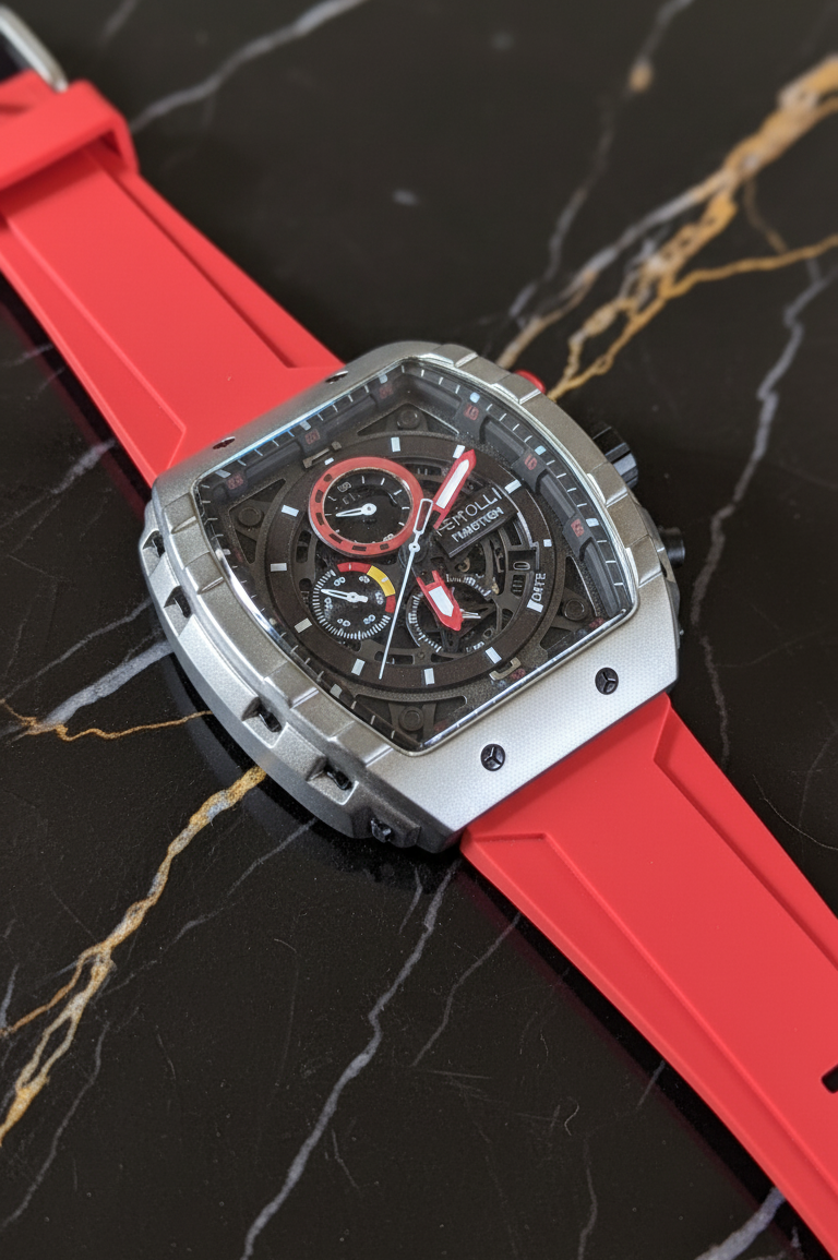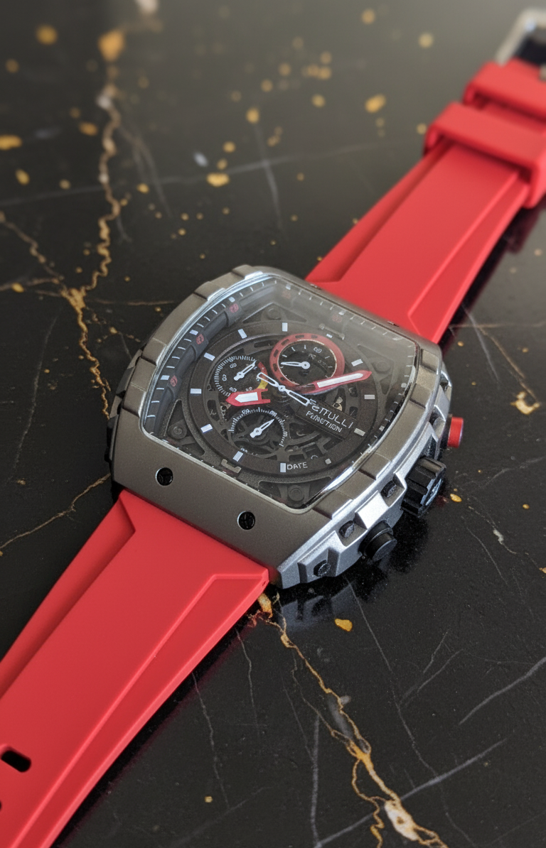 Unconventional and unapologetically bold, The "Ignition" is a timepiece designed for those who live life in the fast lane. Its distinctive tonneau-shaped case, crafted with a high-tech, industrial finish and visible screws, sets it apart from any ordinary watch.